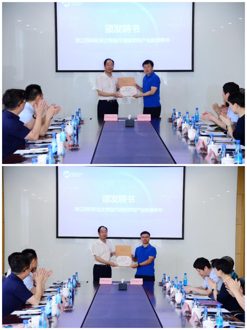 随后,陈厥祥、楼剑锋等同宁波汉科医疗器械有限公司担任人共同为党建联建合作单位、国千大师工作室、产教学研基地、党员博士技术服务流动工作站等4个新的合作平台揭牌。同时,陈厥祥向宁波汉科医疗器械有限公司董事长兼总经理张建明、副总经理刘聪颁发了学校医疗器械学院产业教授聘书。