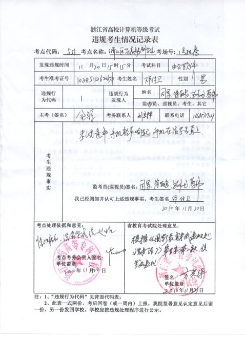 浙江省计算机考试违规先生记录表公示